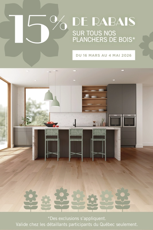 Du 16 mars au 4 mai, profitez de 15 % de rabais sur le PDSF de tous nos planchers (sauf exceptions). C'est aussi le moment idéal pour découvrir liv et livUP, nos nouveaux finis haute performance qui combinent beauté, durabilité et résistance exceptionnelle aux égratignures et impacts. Leurs avantages au quotidien feront une réelle différence dans votre maison.